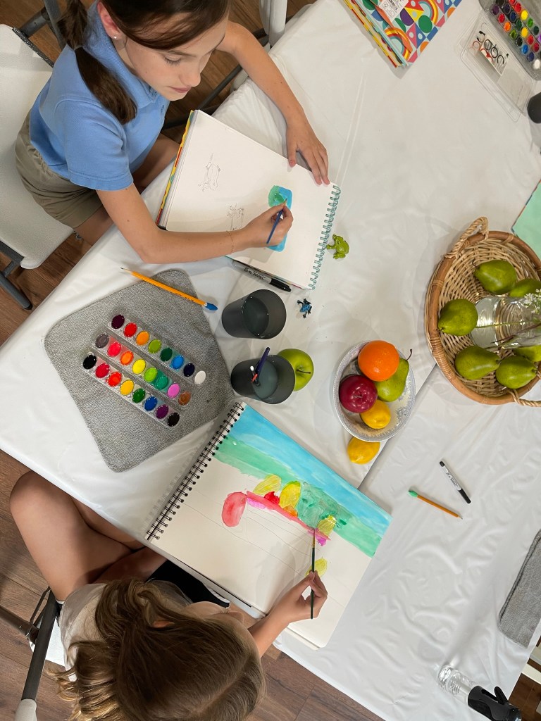 The flow of each session will generally stay the same each week. We will begin with a guided lesson in the sketchbook. Students will take notes and practice the skill/ concept in the sketchbook and then move on to extend the studio space with high-quality paper, canvas, and materials. Students will create freely until 10-15 minutes before the end time in order to clean up and prepare to leave. Each student will have space to leave works in progress until the following week/s. sometimes students can take work home to finish, and sometimes they will remain in the studio, depending on the project. Some weeks we will move through a different lesson each week and some weeks we will continue on the same project, depending on the detail and depth of the work.